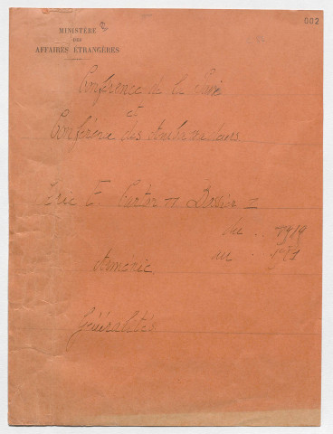 Revendication d'indépendance de la République arménienne [dont programme de libération de l'Arménie], représentation à la Conférence de la paix (janvier-février 1919), nomination et action du Haut-Commissaire interallié (Colonel Haskell) (juillet 1919), rôle de la Légion d'Orient, opérations militaires dans le Caucase, combats contre les Turcs (mai-août 1919), sort des réfugiés arméniens au Caucase, demandes du conseil mixte arménien relatives aux réparations des dommages subis par les Arméniens pendant la guerre, négociations sur les frontières avec l'Azerbaïdjan, menaces de nouveaux massacres contre des populations arméniennes (avril 1919), sort des chrétiens persécutés par les Kémalistes, protestation des patriarches orthodoxes, catholiques et du chef de la communauté arménienne protestante contre le mémoire du gouvernement ottoman relatif au massacre arménien remis aux Hauts commissaires alliés le 12 février 1919 [à noter la présence de deux mémoires imprimés] (juin-août 1919), situation de la Cilicie [dont rapport sur la population de Cilicie avant la Première guerre Mondiale (janvier 1920)], demandes de secours en faveur de la République arménienne [dont memorandum du Secrétaire général de la Société des Nations (novembre 1920)], décision du président Wilson concernant la frontière entre la Turquie et l'Arménie (décembre 1920, versions anglaise et française), introduction du bolchévisme en Arménie, reconnaissance de l'indépendance de l'Arménie (février 1919-septembre 1921).