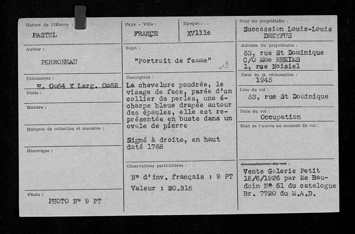 Pour les fiches peintures et dessins (cartons 738 à 760 et 805bis à 809), voir la liste Excel. Les informations relatives aux restitutions ou aux non restitutions doivent pêtre prises avec précaution et confirmées par les décharges de restitutions (série CRA ou série 13BIP).