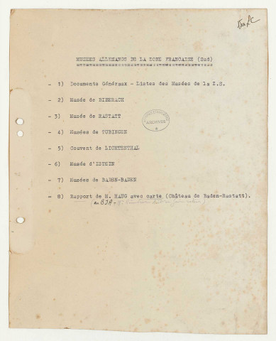 S'ajoutent enfin diverses archives, comme les archives personnelles de Rose Valland en rapport avec les spoliations nazies (série Rose Valland, cotée 209SUP/706-725 et 888-909) et les archives de Michel Martin, de la direction des Musées de France, relatives aux demandes d'exportation d'œuvres (209SUP/1148).