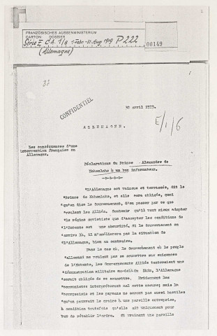 Relations franco-allemandes, projet d'intervention française en Allemagne, instructions à l'ambassadeur français à Berlin, question des réparations, contexte économique et financier français, capacités allemandes (avril 1919-juin 1923) (E.1/23, E.1/19).