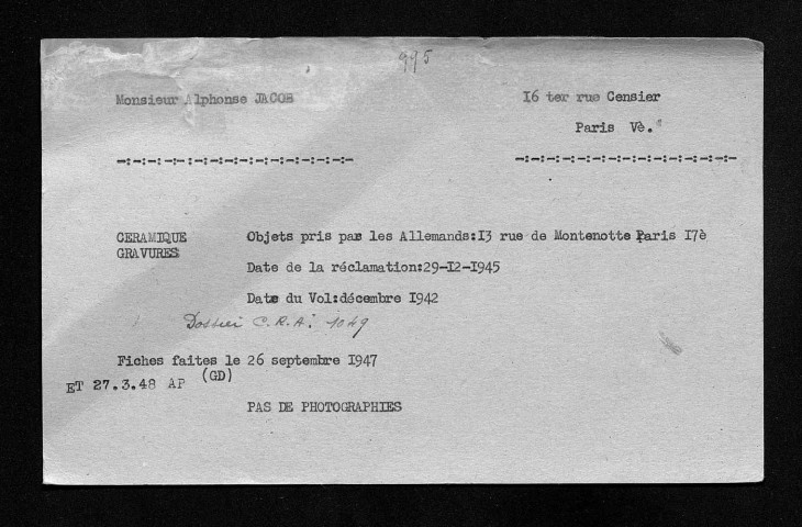 Les 2 443 dossiers nominatifs de réclamation adressés par les victimes à la CRA et à l'OBIP, en vertu des décrets des 13 et 24 novembre 1944 et de l'arrêté du 16 avril 1945, constituent l'origine du fonds (séries CRA et OBIP, cotées 209SUP/1 à 73, et 209SUP/591-705 et 726-737, 209SUP/921-927, 1061-1065, 1100-1145). Ces dossiers se composent de la correspondance entre les victimes et l'administration, des listes et descriptions des biens spoliés, accompagnées parfois de photographies (série « Albums photographiques », cotée 209SUP/933 à 1044), ainsi que des lettres de décharge en cas de restitution des biens.