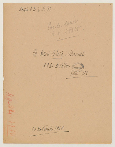 Les 2 443 dossiers nominatifs de réclamation adressés par les victimes à la CRA et à l'OBIP, en vertu des décrets des 13 et 24 novembre 1944 et de l'arrêté du 16 avril 1945, constituent l'origine du fonds (séries CRA et OBIP, cotées 209SUP/1 à 73, et 209SUP/591-705 et 726-737, 209SUP/921-927, 1061-1065, 1100-1145). Ces dossiers se composent de la correspondance entre les victimes et l'administration, des listes et descriptions des biens spoliés, accompagnées parfois de photographies (série « Albums photographiques », cotée 209SUP/933 à 1044), ainsi que des lettres de décharge en cas de restitution des biens.