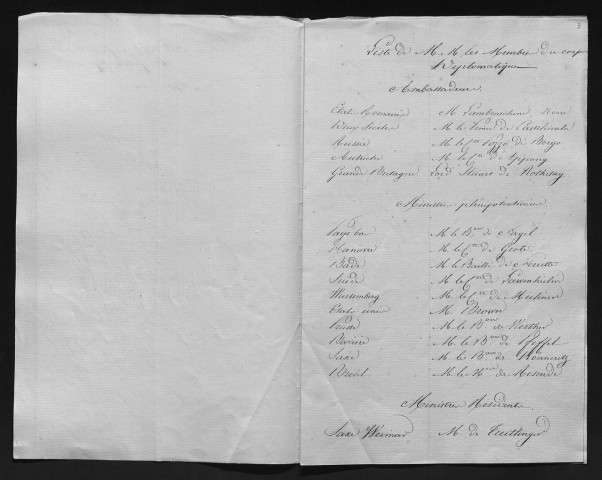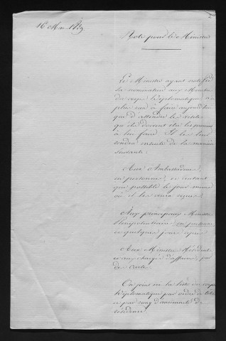 Les documents sont classés dans l'ordre chronologique suivant ainsi la carrière diplomatique de Joseph-Marie Portalis. Celle-ci débute en Saxe en 1801 (482PAAP/1, dossier 1) puis se poursuit dans le sillage de Joseph Bonaparte chargé de négocier ce qui deviendra la paix d'Amiens en mars 1802 (482PAAP/1, dossier 2). Entre 1802 et 1805, on le retrouve successivement secrétaire d'ambassade à Londres, auprès d'Andréossy (482PAAP/2), puis à Berlin (482PAAP/3) et enfin ministre plénipotentiaire à Ratisbonne, représentant de l'Empereur près l'Electeur archichancelier de l'Empire d'Allemagne (482PAAP/4).