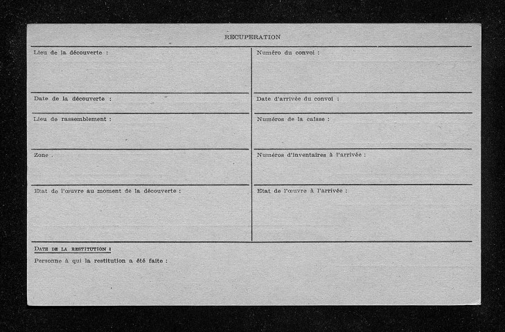 Cette série contient les fichiers - fichiers d'oeuvres spoliées, fichiers d'oeuvres rassemblées dans les collectings points puis rapatriées, fichiers de propriétaires spoliés, fichiers d'achats faits par les Allemands, autres fichiers - établis par les services de récupération artistique (Commission de récupération artistique, Bureau central des restitutions, Bureau d'investigation artistique, Collecting Points). Classement par types d'objets, noms d'artistes, noms de collectionneurs, noms de marchands.