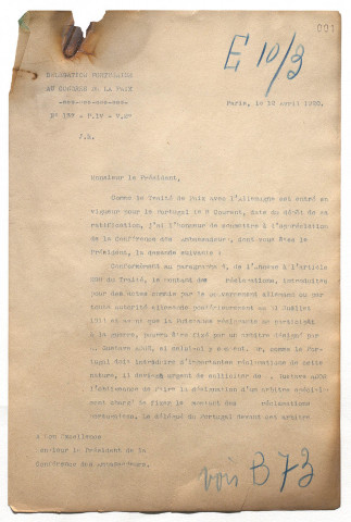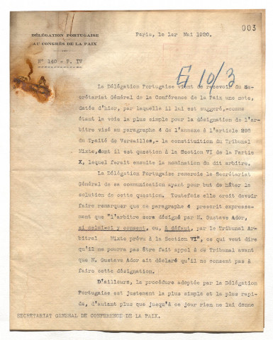 Application de l'article 298 du Traité de Versailles ainsi que la réparation des dommages causés par l'Allemagne (avril-mai 1920).