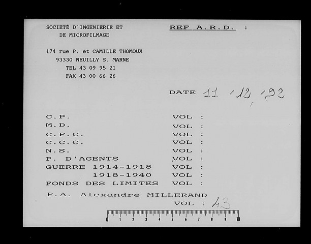 Le fond Millerand comprenait au départ 41 cartons; le travail de classement a surtout consisté en l'articulation des différentes séries qui ont été divisées en 101 volumes : les plus intéressants ont été reliés. Un inventaire numérique du nouveau classement a été établi; pour faciliter les recherches, on a dressé une table de concordance de l'ancien et du nouveau classement.