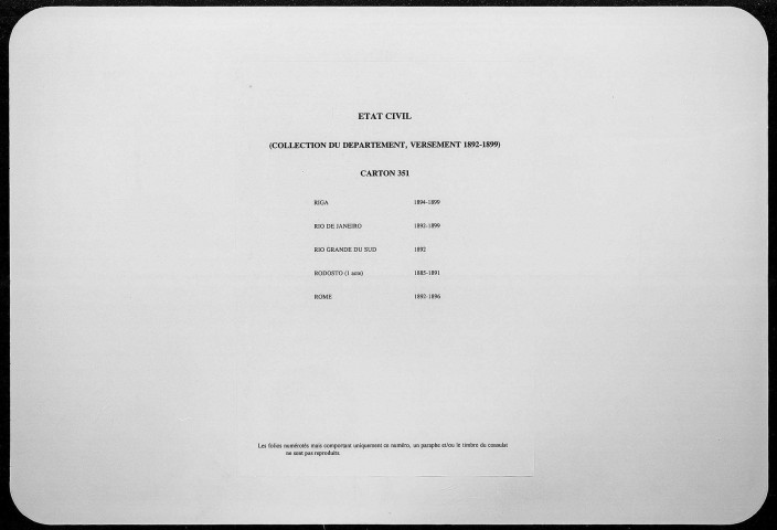 Il est également à noter que le versement des registres d'état civil de 1900 n'avait été effectué que pour les postes d'Aden à Rome. Les registres des postes de Rosario à Zurich avaient été classés dans la série 486QO. Ces derniers en ont été extraits en 2024 pour être réintégrés dans la sous-série 1900 de la série 172QO où ils constituent les cartons 372 à 374.