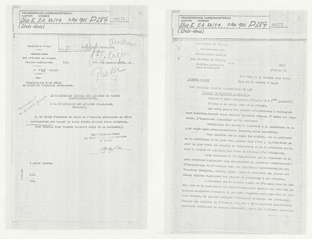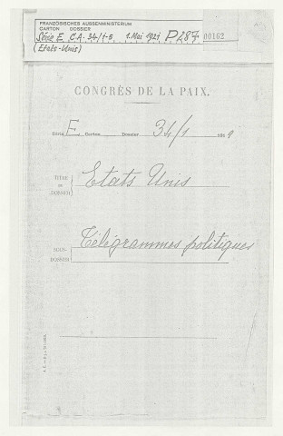 Opinions et espoirs des États-uniens par rapport à la Conférence de la paix : revue de presse américaine (janvier 1919) et avis d'experts de la finance (novembre 1919). Volonté de d'appliquer la doctrine Monroe (juillet 1919), demande d'aide pour le ravitaillement de l'Europe centrale qui subit une famine (avril 1920) [Fo.1-34].