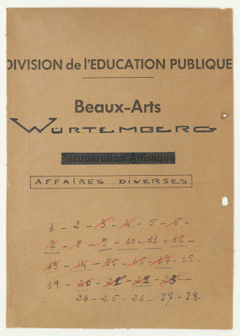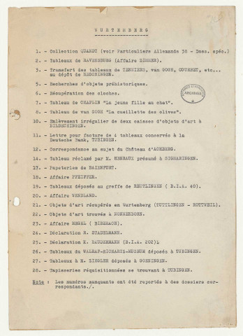 Les fichiers d'œuvres spoliées (série « Fichiers », cotée 209SUP/738-887) ont été établis d'après les déclarations de victimes ou d'après la listes des biens retrouvés en Allemagne et en Autriche.