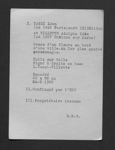 Pour les fiches peintures et dessins (cartons 738 à 760 et 805bis à 809), voir la liste Excel. Les informations relatives aux restitutions ou aux non restitutions doivent pêtre prises avec précaution et confirmées par les décharges de restitutions (série CRA ou série 13BIP).