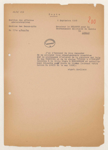dossiers réalisés par le Service de remise en place des œuvres d'art en 1951.