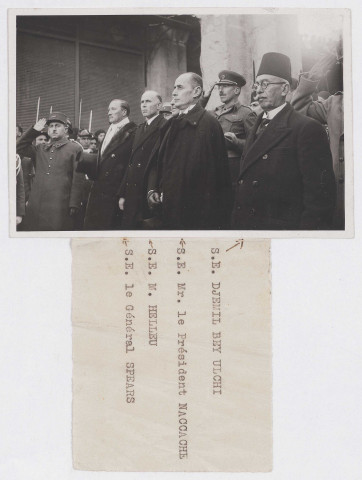 Les mentions en italique reprennent des commentaires apposés au revers des photos, souvent la mention d'un organe de presse ou l'identification de personnes. Pour l'orthographe des noms propres, la transcription suit la graphie admise à l'époque.