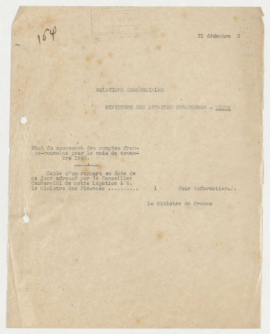Les documents les plus anciens (quelques documents en roumain, 1779-1839) sont conservés dans le carton 1. On notera la présence d'intéressantes dépêches de Paul Morand dans le carton 415.