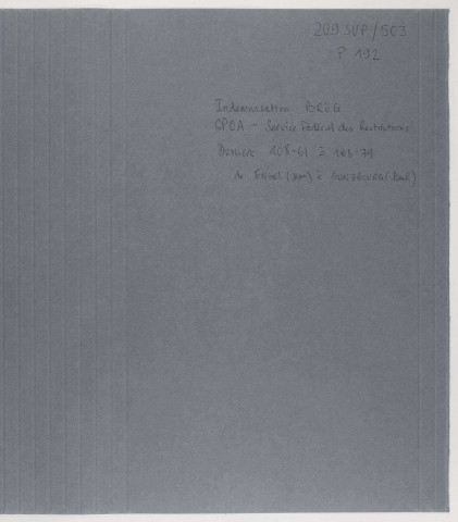 Les 2 443 dossiers nominatifs de réclamation adressés par les victimes à la CRA et à l'OBIP, en vertu des décrets des 13 et 24 novembre 1944 et de l'arrêté du 16 avril 1945, constituent l'origine du fonds (séries CRA et OBIP, cotées 209SUP/1 à 73, et 209SUP/591-705 et 726-737, 209SUP/921-927, 1061-1065, 1100-1145). Ces dossiers se composent de la correspondance entre les victimes et l'administration, des listes et descriptions des biens spoliés, accompagnées parfois de photographies (série « Albums photographiques », cotée 209SUP/933 à 1044), ainsi que des lettres de décharge en cas de restitution des biens.