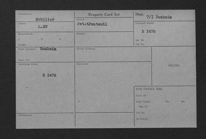 Les fichiers d'œuvres spoliées (série « Fichiers », cotée 209SUP/738-887) ont été établis d'après les déclarations de victimes ou d'après la listes des biens retrouvés en Allemagne et en Autriche.