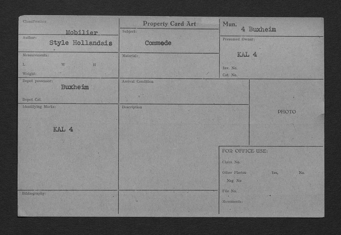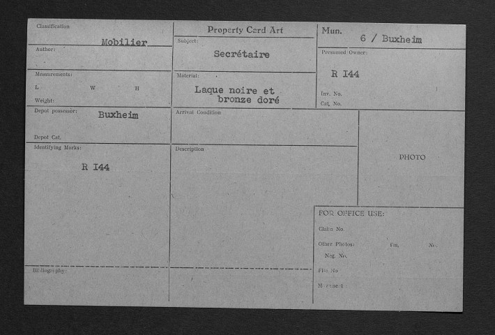 Cette série contient les fichiers - fichiers d'oeuvres spoliées, fichiers d'oeuvres rassemblées dans les collectings points puis rapatriées, fichiers de propriétaires spoliés, fichiers d'achats faits par les Allemands, autres fichiers - établis par les services de récupération artistique (Commission de récupération artistique, Bureau central des restitutions, Bureau d'investigation artistique, Collecting Points). Classement par types d'objets, noms d'artistes, noms de collectionneurs, noms de marchands.