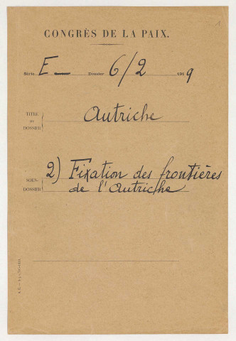 Délimitation des frontières de l'Autriche avec l'Allemagne, l'Italie, la Hongrie, la Tchécoslovaquie et la Yougoslavie, opinion française sur le morcellement du territoire et le rattachement de l'Autriche à l'Allemagne (mai 1919-février 1922). Plébiscites des villages de la rive Est de la Vistule (août 1920) (mai 1919-février 1922) [à noter la présence de cartes].
