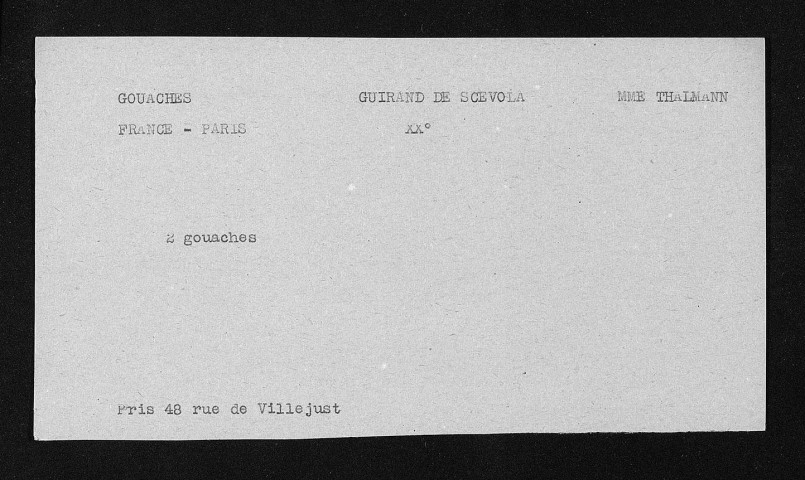 Pour les fiches peintures et dessins (cartons 738 à 760 et 805bis à 809), voir la liste Excel. Les informations relatives aux restitutions ou aux non restitutions doivent pêtre prises avec précaution et confirmées par les décharges de restitutions (série CRA ou série 13BIP).