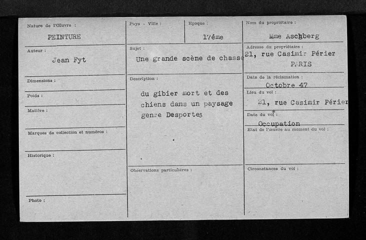 Les fichiers d'œuvres spoliées (série « Fichiers », cotée 209SUP/738-887) ont été établis d'après les déclarations de victimes ou d'après la listes des biens retrouvés en Allemagne et en Autriche.