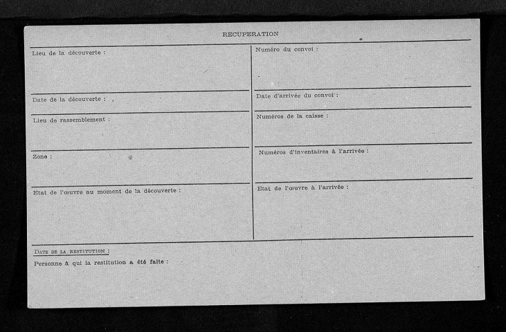 Cette série contient les fichiers - fichiers d'oeuvres spoliées, fichiers d'oeuvres rassemblées dans les collectings points puis rapatriées, fichiers de propriétaires spoliés, fichiers d'achats faits par les Allemands, autres fichiers - établis par les services de récupération artistique (Commission de récupération artistique, Bureau central des restitutions, Bureau d'investigation artistique, Collecting Points). Classement par types d'objets, noms d'artistes, noms de collectionneurs, noms de marchands.
