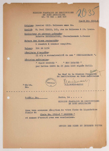 À ces dossiers de réclamation s'ajoutent les archives des services français localisés en zone d'occupation en Allemagne et en Autriche, chargés de retrouver et de rapatrier les biens spoliés (séries alphabétiques A à R, cotées 209SUP/108 à 590). Ces archives comprennent les claims, les correspondances entre services, les rapports d'enquêtes, les liaisons avec les zones d'occupation alliées et leurs collecting points, les listes de biens rapatriés en France.
