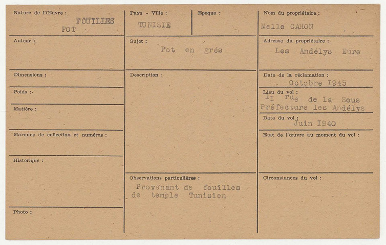 Les fichiers d'œuvres spoliées (série « Fichiers », cotée 209SUP/738-887) ont été établis d'après les déclarations de victimes ou d'après la listes des biens retrouvés en Allemagne et en Autriche.