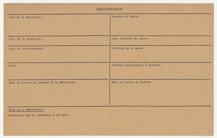 Cette série contient les fichiers - fichiers d'oeuvres spoliées, fichiers d'oeuvres rassemblées dans les collectings points puis rapatriées, fichiers de propriétaires spoliés, fichiers d'achats faits par les Allemands, autres fichiers - établis par les services de récupération artistique (Commission de récupération artistique, Bureau central des restitutions, Bureau d'investigation artistique, Collecting Points). Classement par types d'objets, noms d'artistes, noms de collectionneurs, noms de marchands.