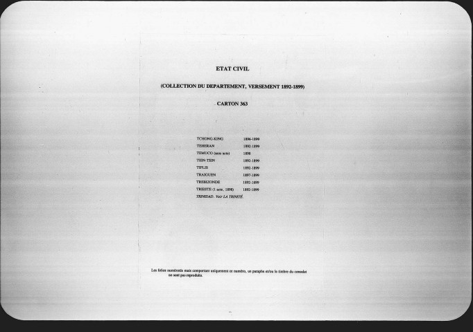 Il est également à noter que le versement des registres d'état civil de 1900 n'avait été effectué que pour les postes d'Aden à Rome. Les registres des postes de Rosario à Zurich avaient été classés dans la série 486QO. Ces derniers en ont été extraits en 2024 pour être réintégrés dans la sous-série 1900 de la série 172QO où ils constituent les cartons 372 à 374.