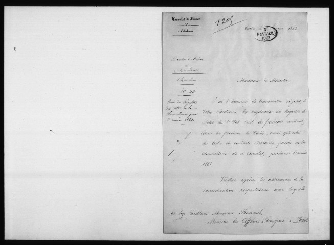 • Le premier, le registre primata, est conservé pendant 100 ans après clôture par le poste avant d'être versé aux Archives diplomatiques. La collection des registres primata est déposée au Centre des Archives diplomatiques de Nantes.