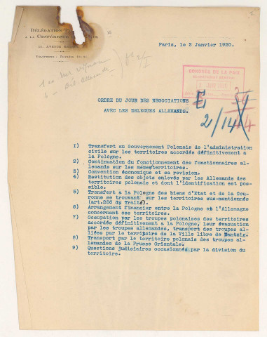 Tensions germano-polonaises, revendications territoriales de la côte de Dantzig à Memel, cession de territoires à la Pologne, liberté de transit entre l'Allemagne et la Prusse orientale, négociations, désarmement des pays rhénans, garantie de sécurité, pacte de non-agression (octobre 1918-février 1933). Demande du Portugal relative à l'attribution des mandats des anciennes colonies allemandes (mai 1919).