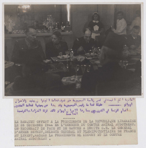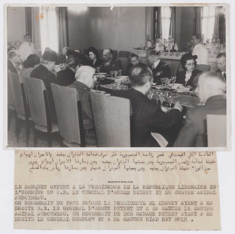 Banquet en l'honneur du contre-amiral Auboyneau commandant la 5e Division des Croiseurs, à la présidence libanaise