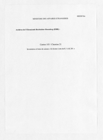 Copies des listes d'œuvres dressées par le service allemand ERR au moment des spoliations. S'y ajoutent des archives retrouvées par les Alliés documentant l'activité de l'ERR.