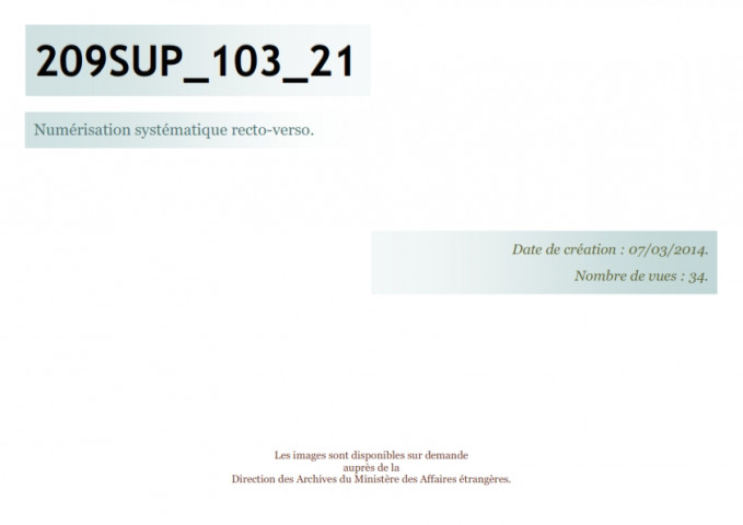 Les cartons 209SUP/90 à 106 ont été numérisés. Ces numérisations sont accessibles en salle de lecture du Centre des archives diplomatiques de La Courneuve.