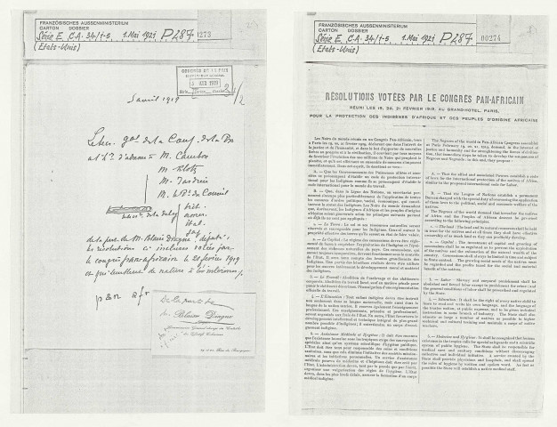 Congrès Pan-Africain revendications pour la protection des indigènes d'Afrique et des peuples d'origines africaines : résolutions votées par le congrès Pan-Africain (février 1919), protestation des Américains de couleur : pétition en faveur de la démocratie mondiale adressée à la Conférence de la paix (mai 1919) (décembre 1918-juillet 1919) [Fo.1-28].