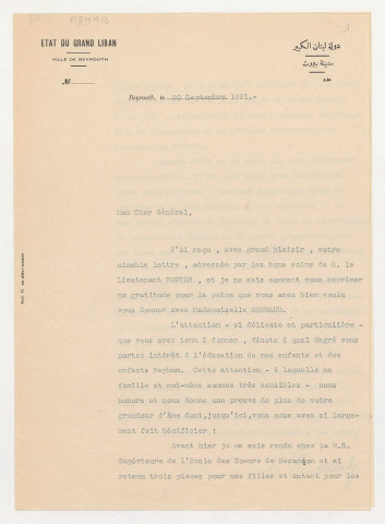 Fonds Auguste Terrier (Ms 5891-6023), en particulier les lettres du général Gouraud (Ms 5899, fol. 61-556 et Ms 5900, fol. 1-127) ainsi que de la correspondance reçue de divers membres de la famille Gouraud.