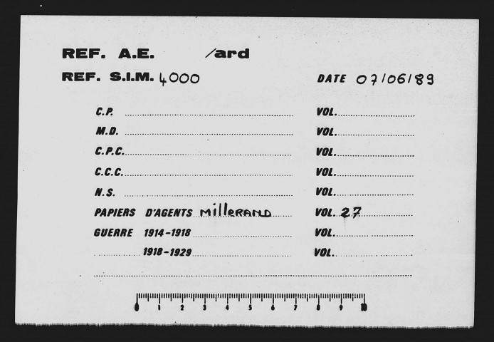 Le reste des papiers laissés par Millerand a été remis à la Bibliothèque Nationale qui les a ensuite cédés aux Archives nationales où ils sont conservés sous la cote 470 AP, voir fiche descriptive du fonds, pp. 725-727.