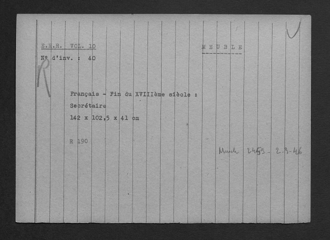Cette série contient les fichiers - fichiers d'oeuvres spoliées, fichiers d'oeuvres rassemblées dans les collectings points puis rapatriées, fichiers de propriétaires spoliés, fichiers d'achats faits par les Allemands, autres fichiers - établis par les services de récupération artistique (Commission de récupération artistique, Bureau central des restitutions, Bureau d'investigation artistique, Collecting Points). Classement par types d'objets, noms d'artistes, noms de collectionneurs, noms de marchands.