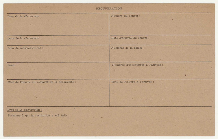 Pour les fiches peintures et dessins (cartons 738 à 760 et 805bis à 809), voir la liste Excel. Les informations relatives aux restitutions ou aux non restitutions doivent pêtre prises avec précaution et confirmées par les décharges de restitutions (série CRA ou série 13BIP).