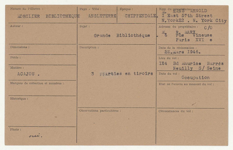 Les fichiers d'œuvres spoliées (série « Fichiers », cotée 209SUP/738-887) ont été établis d'après les déclarations de victimes ou d'après la listes des biens retrouvés en Allemagne et en Autriche.