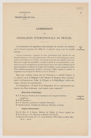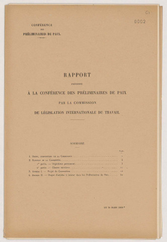 Le premier article couvre la Conférence internationale socialiste de Berne de février 1919 qui aurait dû se tenir à Paris, mais que les puissances alliées ont réussi à détourner vers la Suisse pour éviter toute altercation pendant la Conférence de paix. Toutefois, les membres de la Conférence ont tout de même perçu la nécessité de créer une commission qui étudierait la législation internationale du travail. L'article 2 est un dossier général qui rassemble une documentation diversifiée sur les sujets abordés par la Commission, mais aussi sur l'influence des acteurs extérieurs à la Commission. Les articles 3 à 6 font état des travaux de la Commission de législation internationale du travail à travers la documentation officielle (rapport, sténographies et procès-verbaux des séances). L'article 7 concerne l'organisation et le déroulement de la Conférence internationale du travail de Washington du 29 octobre au 29 novembre 1919, première rencontre officielle de l'OIT.