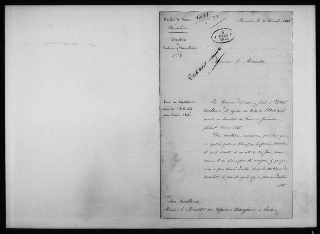 Registres d'état civil consulaire : naissances, mariages, décès. Ces registres consistent souvent en de simples cahiers de quelques feuillets ou des volumes reliés couvrant chacun une année. Cependant, les registres d'état civil de certains postes, en particulier d'Afrique du Nord, ont été reliés avant leur versement aux Archives diplomatiques en volumes regroupant les registres sur plusieurs années. Certains registres ne contiennent aucun acte.