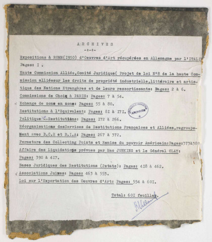 Ce fonds constitue la principale source française d'informations sur les spoliations de biens culturels commises contre les victimes juives (Alliance israélite universelle, consistoires, particuliers) et les victimes non juives (musées, bibliothèques, particuliers) pendant la Seconde Guerre mondiale. Il donne des éléments d'information sur les biens signalés spoliés par les victimes ou rapatriés par les services chargés de la récupération artistique. Il peut donner des informations sur l'itinéraire du bien, sa spoliation, sa récupération éventuelle et son rapatriement.