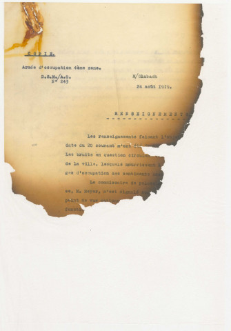 Maintien de l'ordre, état d'esprit des populations, propagande spartakiste, frais des services pénitentiaires, circulation des personnes, arrestations, contrôle postal, propagande anti-française (avril 1919-septembre 1922).