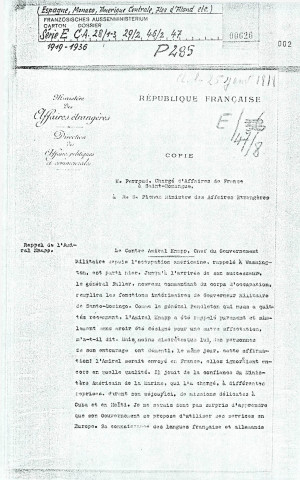 Saint-Domingue (E.47/8), réaffectation de l'Amiral Knapp chef américain du corps d'occupation de et l'influence pro-française des habitants (janvier 1919) [Fo.1-2].