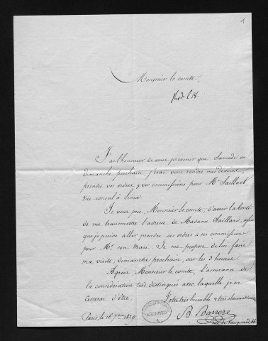 Les documents sont classés dans l'ordre chronologique suivant ainsi la carrière diplomatique de Joseph-Marie Portalis. Celle-ci débute en Saxe en 1801 (482PAAP/1, dossier 1) puis se poursuit dans le sillage de Joseph Bonaparte chargé de négocier ce qui deviendra la paix d'Amiens en mars 1802 (482PAAP/1, dossier 2). Entre 1802 et 1805, on le retrouve successivement secrétaire d'ambassade à Londres, auprès d'Andréossy (482PAAP/2), puis à Berlin (482PAAP/3) et enfin ministre plénipotentiaire à Ratisbonne, représentant de l'Empereur près l'Electeur archichancelier de l'Empire d'Allemagne (482PAAP/4).