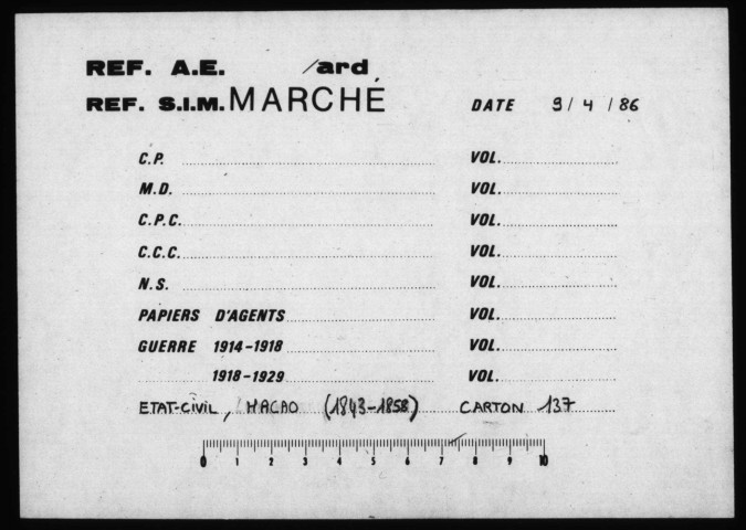 Les registres ayant été versés en volumes reliés de plusieurs années, ne correspondant pas au découpage chronologique ci-dessus, ont été intégrés dans série ad hoc, dite des Volumes par opposition aux sous-séries des Cartons.