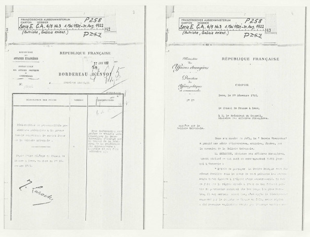 Revendication du territoire par la Pologne et l'Ukraine, intérêts alliés, occupation militaire polonaise puis attribution du territoire à la Pologne, exactions des troupes polonaises et manquements aux conditions d'attribution, droits des minorités nationales, sort des institutions, fonds et fonctionnaires de l'ancien empire austro-hongrois, offensive et propagande bolchéviques, occupation de la Bucovine par la Roumanie (février 1919-décembre 1928) . Indemnités des invalides, rentiers, veuves et orphelins des cheminotiers de l'ancien Etat autrichien (janvier 1927).