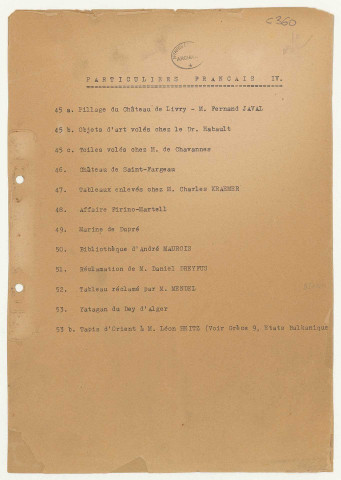 Les fichiers d'œuvres spoliées (série « Fichiers », cotée 209SUP/738-887) ont été établis d'après les déclarations de victimes ou d'après la listes des biens retrouvés en Allemagne et en Autriche.