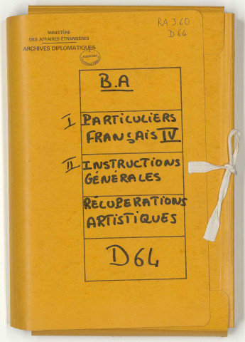 Ce fonds constitue la principale source française d'informations sur les spoliations de biens culturels commises contre les victimes juives (Alliance israélite universelle, consistoires, particuliers) et les victimes non juives (musées, bibliothèques, particuliers) pendant la Seconde Guerre mondiale. Il donne des éléments d'information sur les biens signalés spoliés par les victimes ou rapatriés par les services chargés de la récupération artistique. Il peut donner des informations sur l'itinéraire du bien, sa spoliation, sa récupération éventuelle et son rapatriement.