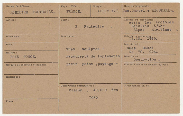 Les fichiers d'œuvres spoliées (série « Fichiers », cotée 209SUP/738-887) ont été établis d'après les déclarations de victimes ou d'après la listes des biens retrouvés en Allemagne et en Autriche.